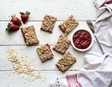Homemade, sugar-free strawberry chia jam nestled between two layers of oaty goodness. It could be your new favourite breakfast bar alongside your morning coffee or your afternoon treat with tea!